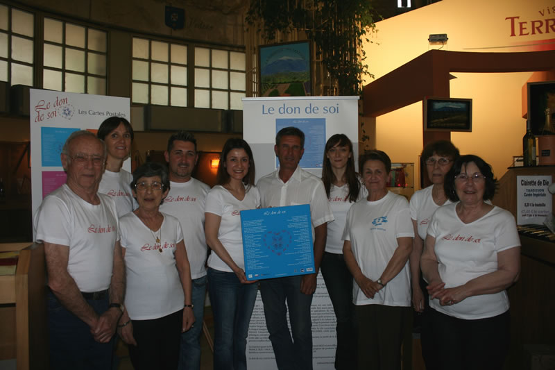 C’est avec l’association A.M.P et ses bénévoles, Maryse Aldié de France Adot Vaucluse, Gérard Lantin, Richard Bagnol, Cécilia Dardalhon et Stéphane Reynaud ainsi que le Maire de Châteauneuf de Gadagne et Dominique Pons, qu’Hélène Palumbo et Anne-Lise Dardalhon ont remis la toile, Le don de soi, au Président de la cave Terres d’Avignon, Yvan Alliaud.
