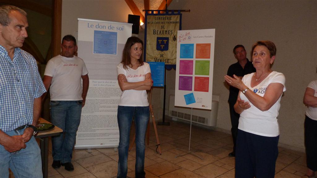 C’est donc le 24 juin 2011 qu’Hélène Palumbo, l’association A.M.P et ses bénévoles, Eric Vernier, Maryse Aldié de France Adot Vaucluse, Richard Bagnol, Jean-Christophe Boyet et Gérard Lantin ont remis la toile, Le don de soi à Claude Chabran et aux administrateurs de la cave Balma Venitia.